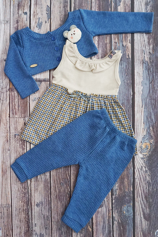 3-Piece Cotton Frock, Shrug & Pajami (Blue)